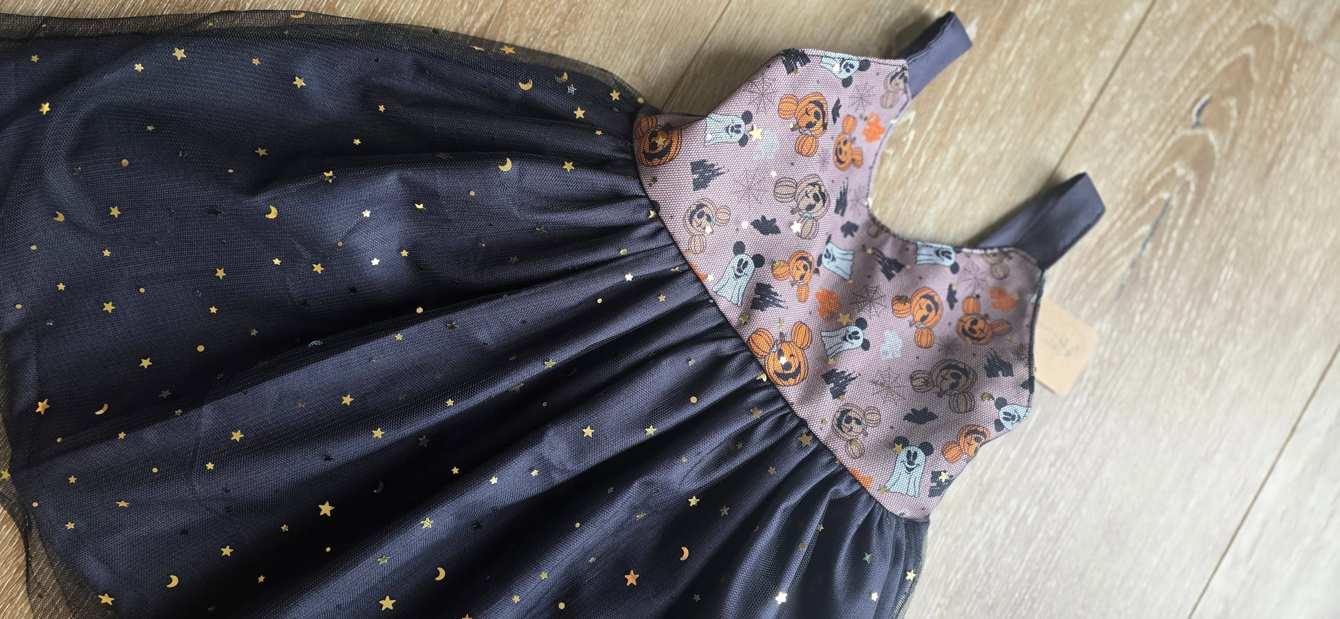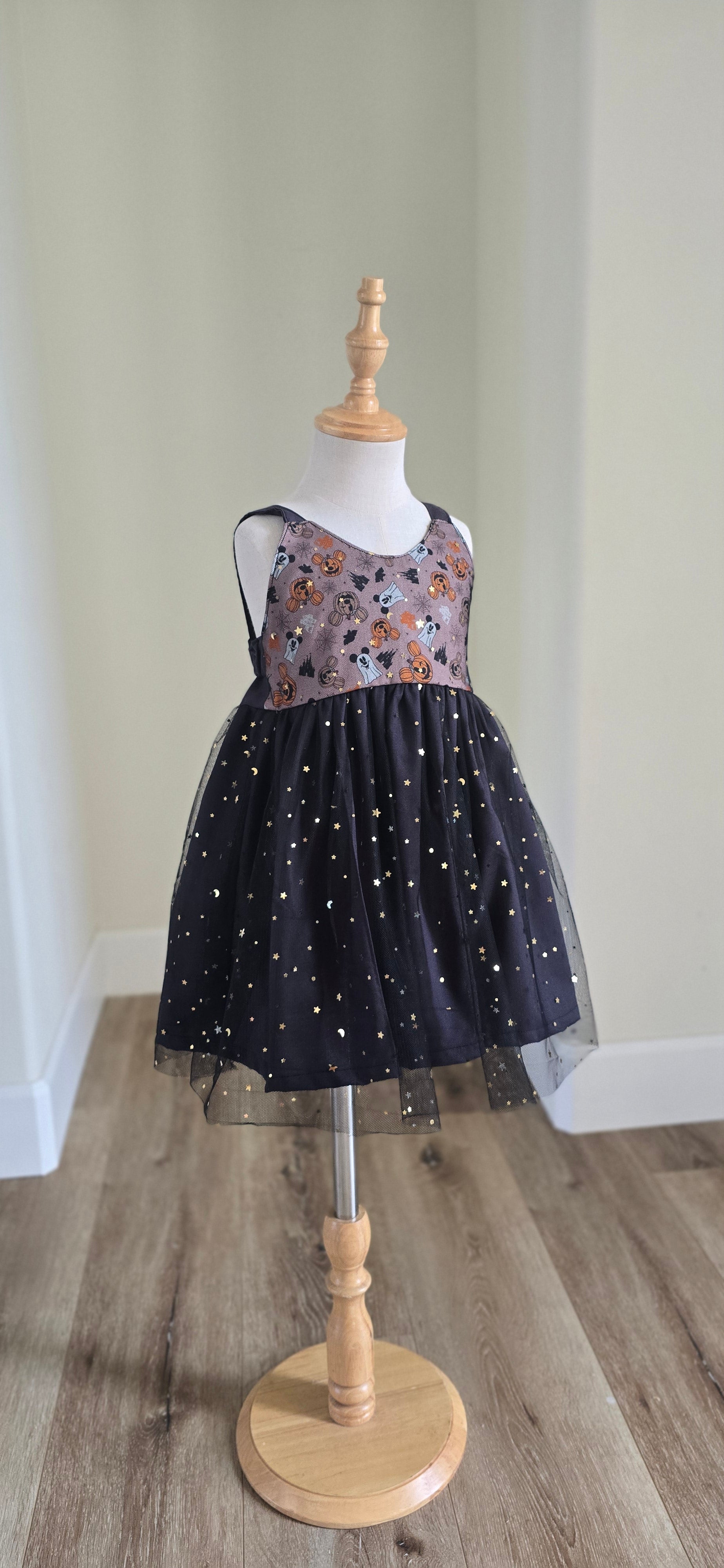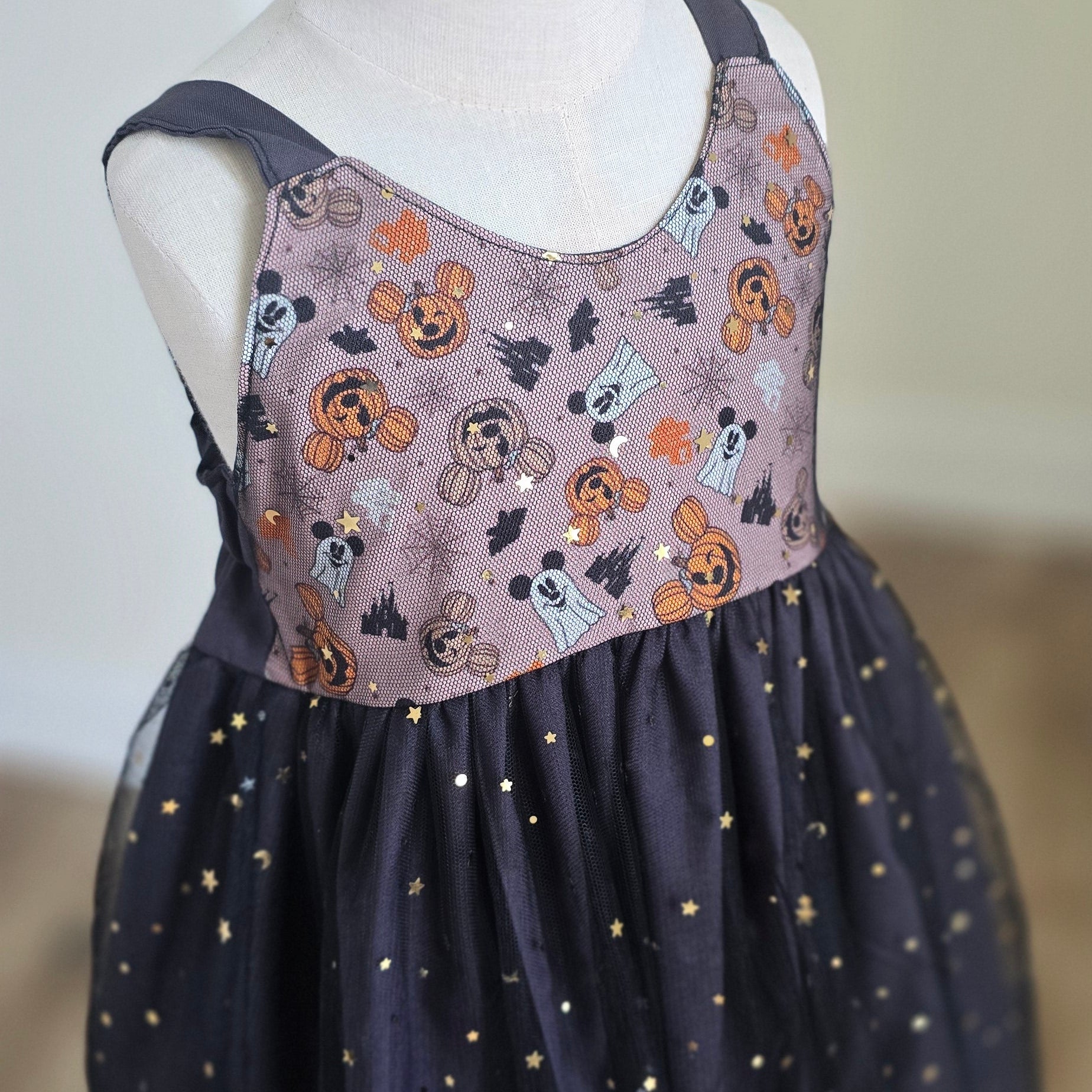 Features magical place's characters and attributes in Halloween decor on the front bodice. Dress skirt layered with stars tulle. Wide straps. Stretchy back. 100% cotton and tulle.