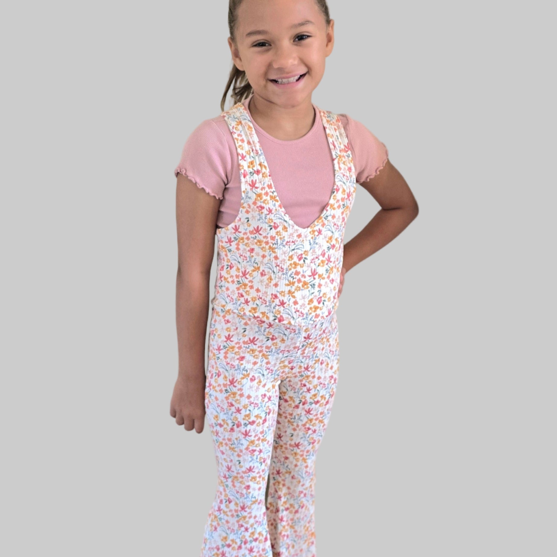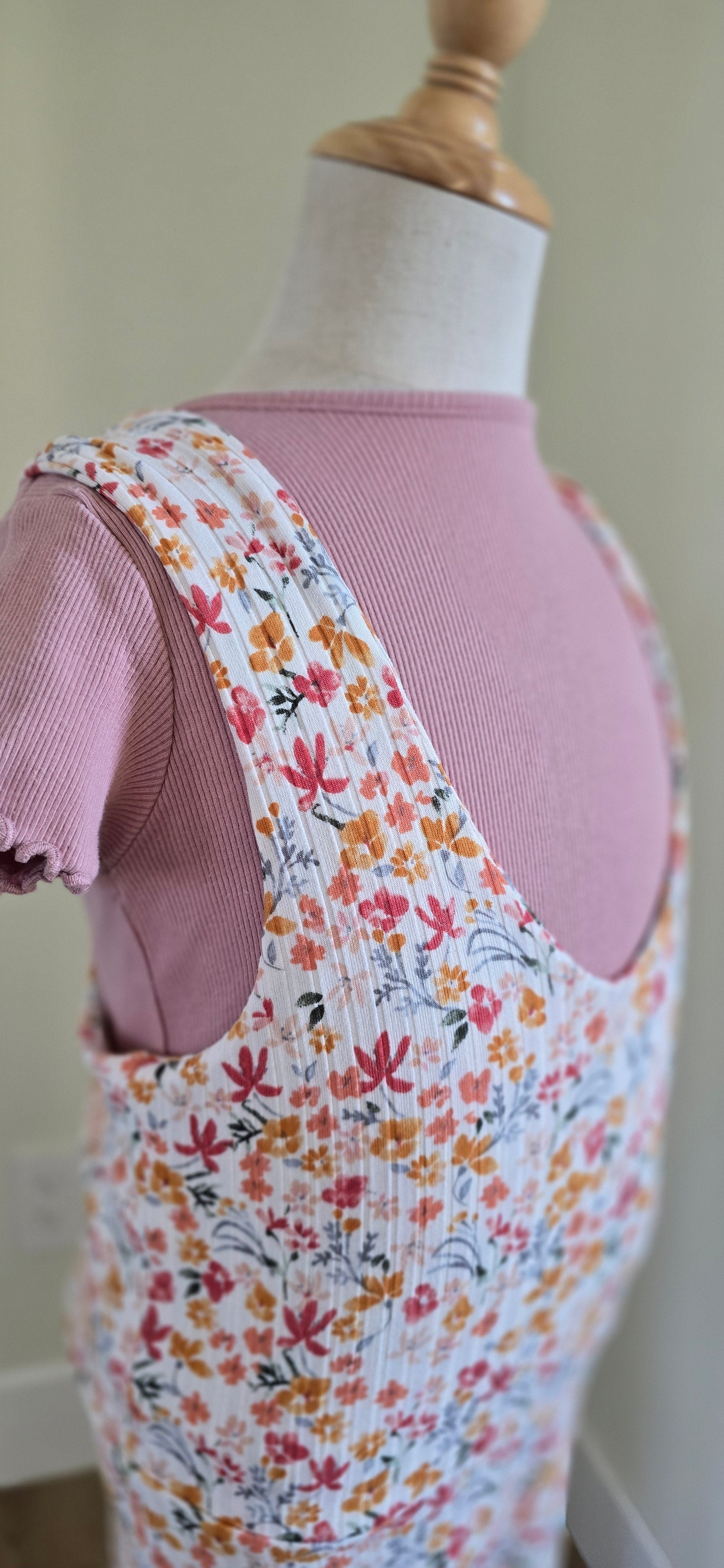 Low-cut floral flare jumpsuit. Stretchy. Crisp cross back. Overalls style - requires an under shirt. Gorgeous fall flowers print all over. Rib polyester.