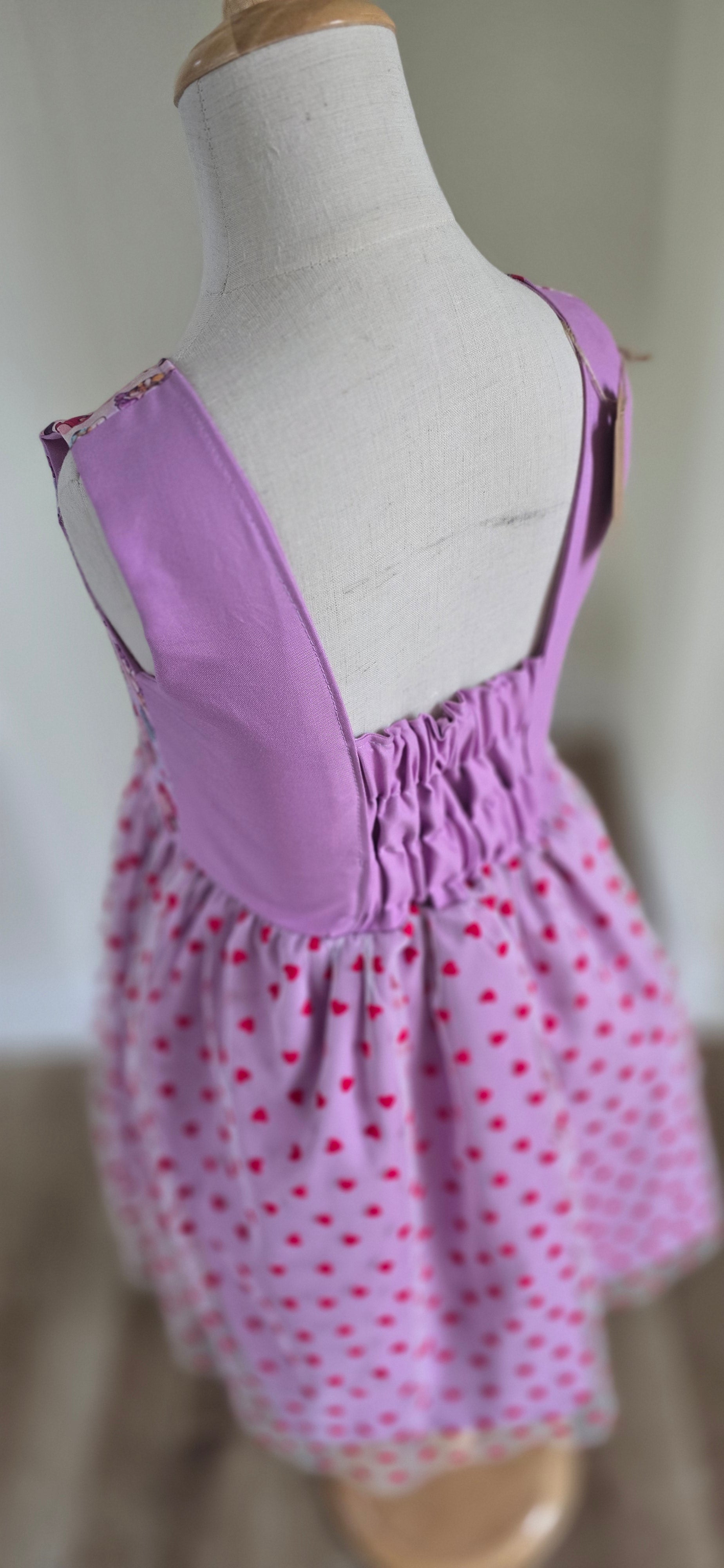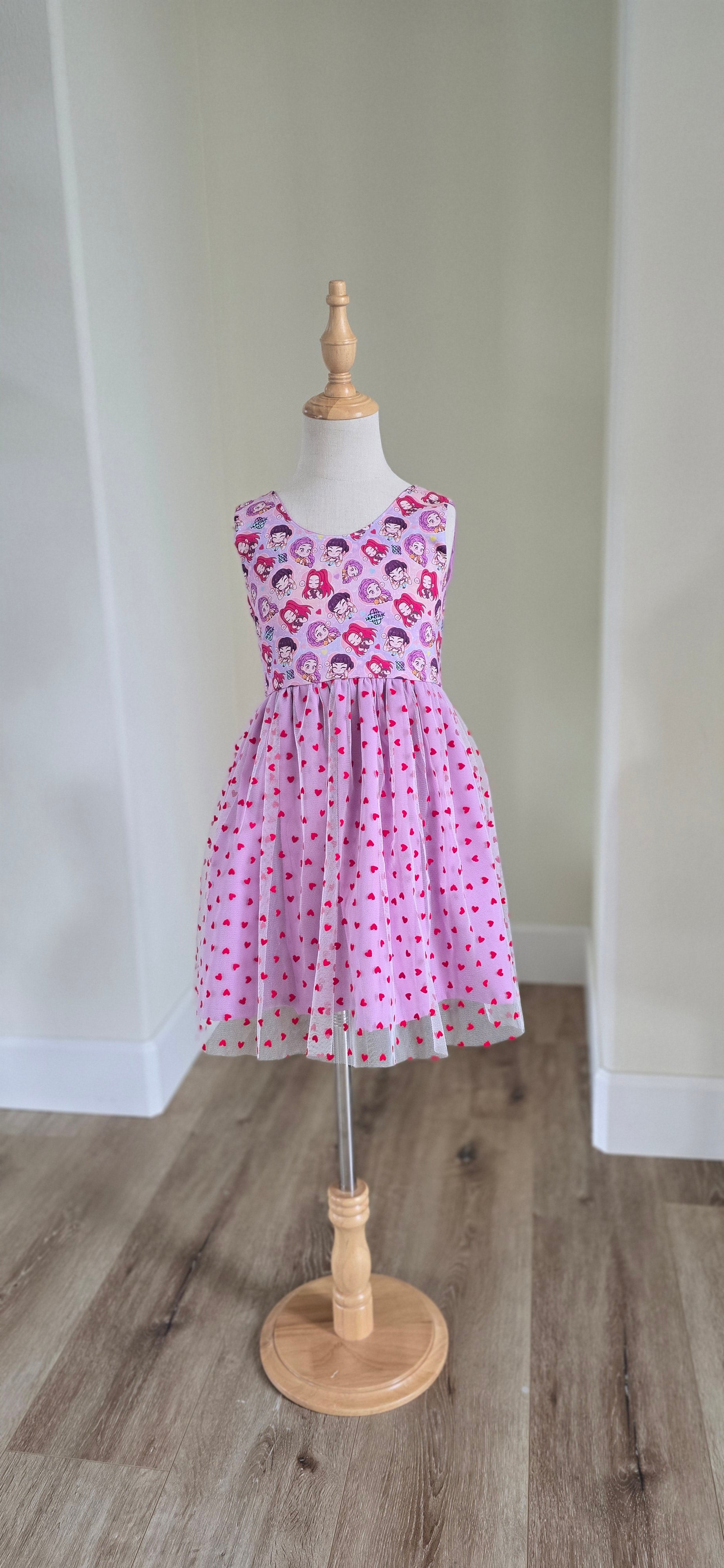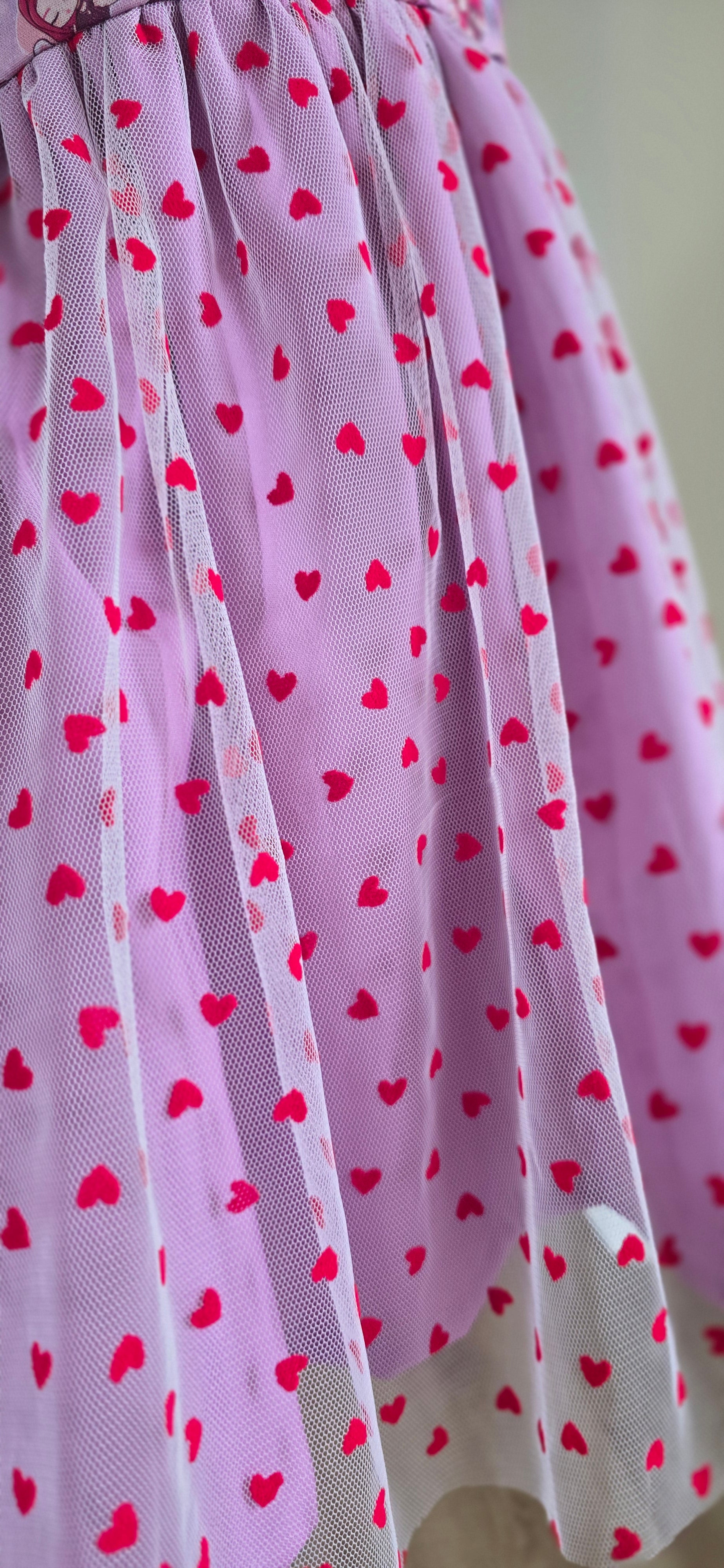 Sleeveless dress with tulle red hearts skirt. Your favorites character print on front bodice. Stretchy back. 100% cotton and tulle.