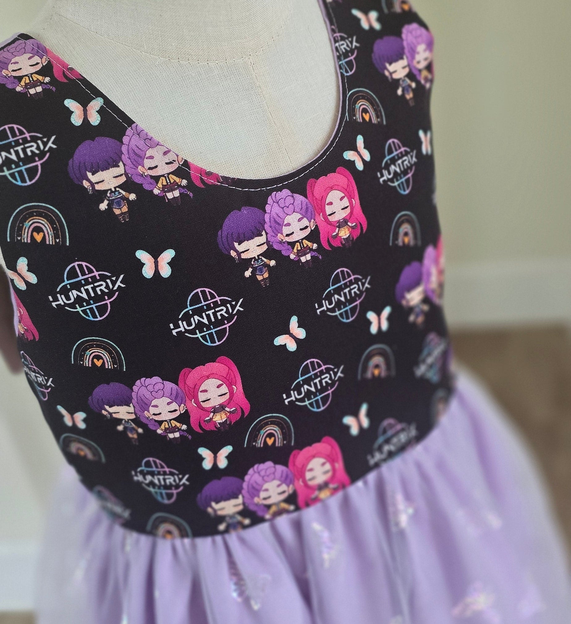 Sleeveless dress with tulle butterfly skirt. Your favorites character print on front bodice. Stretchy back. 100% cotton and tulle.