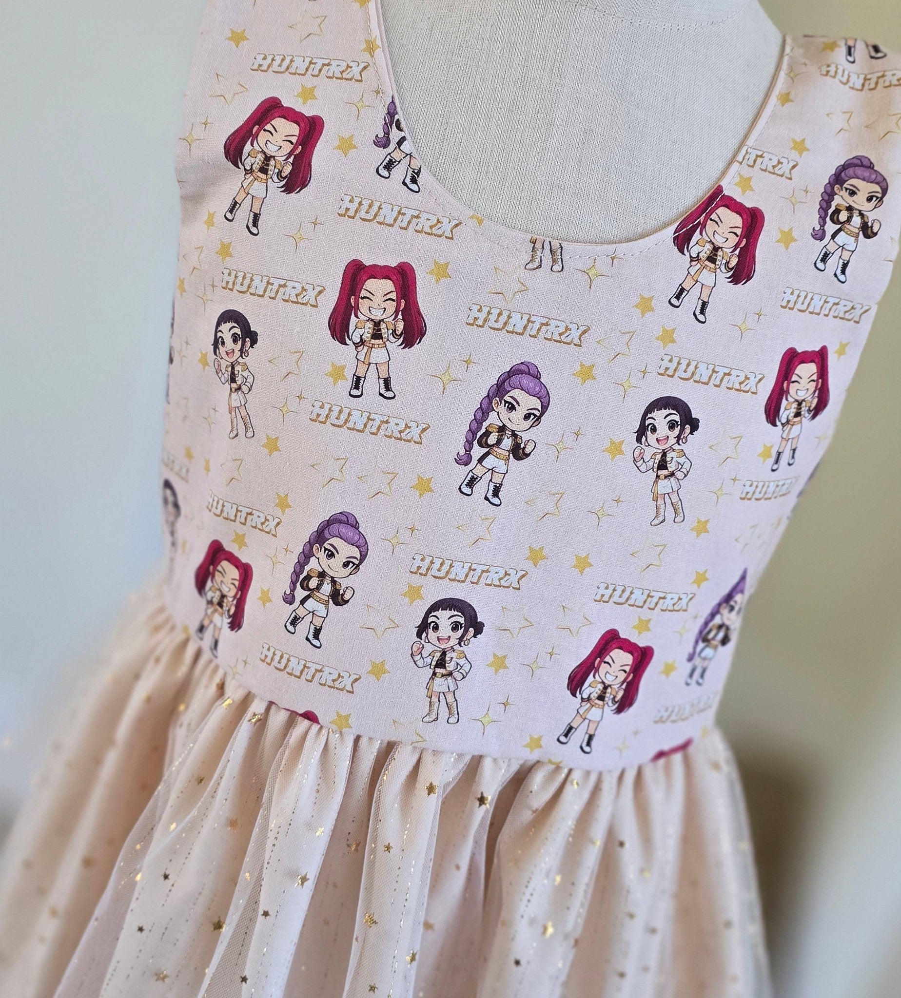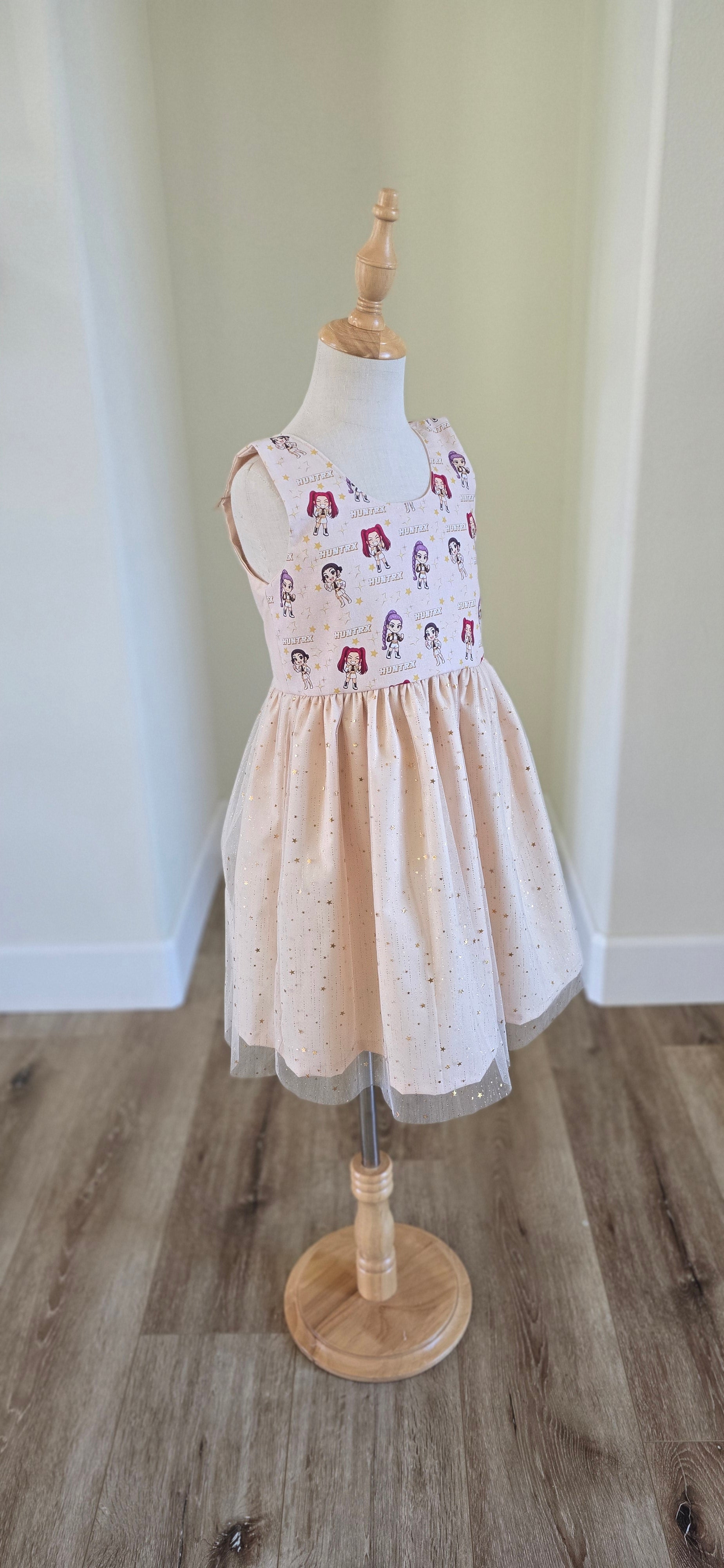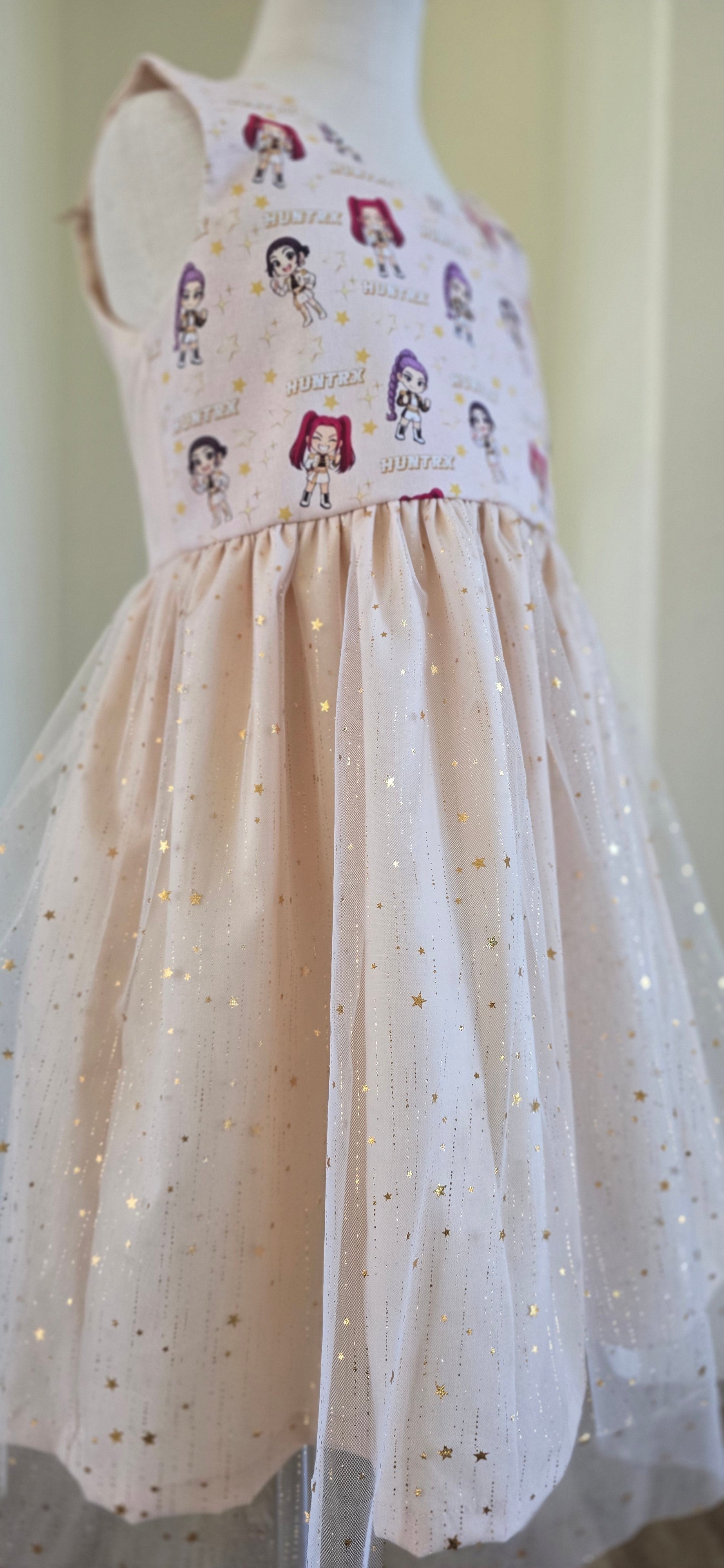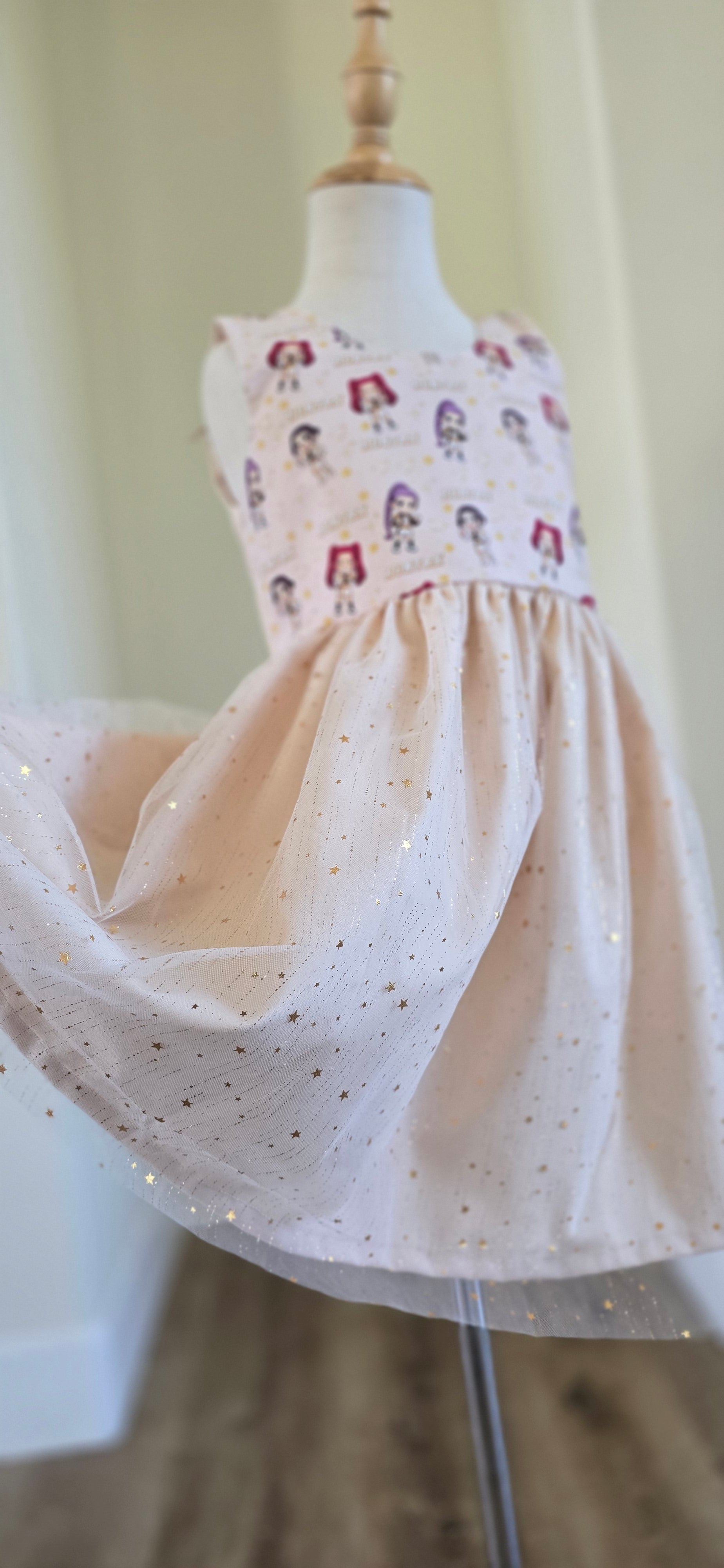 Sleeveless dress with stars tulle skirt. Your favorite character print on front bodice. Stretchy back. 100% cotton and tulle.