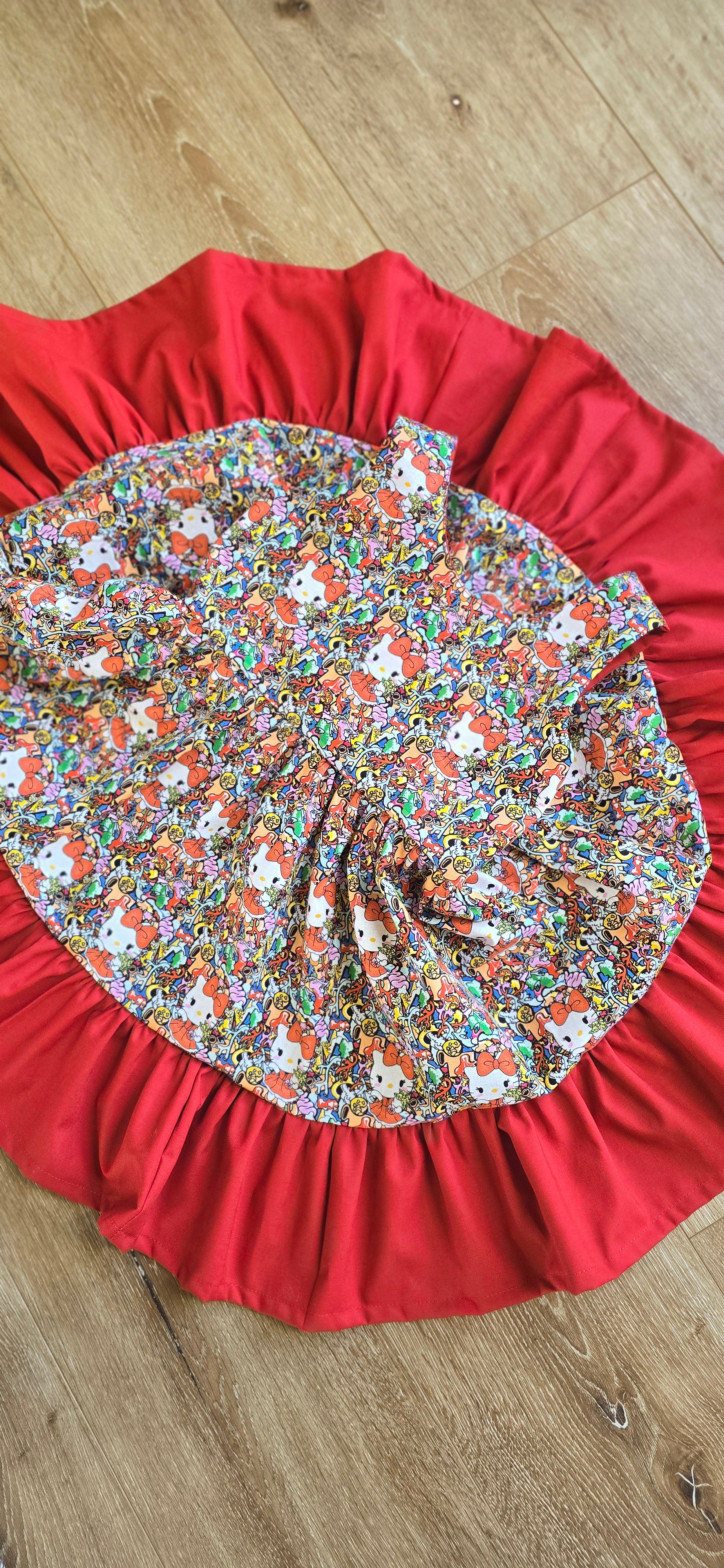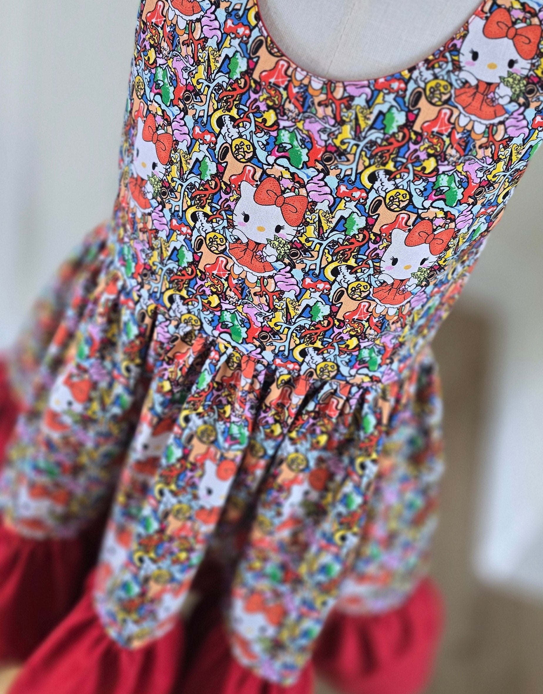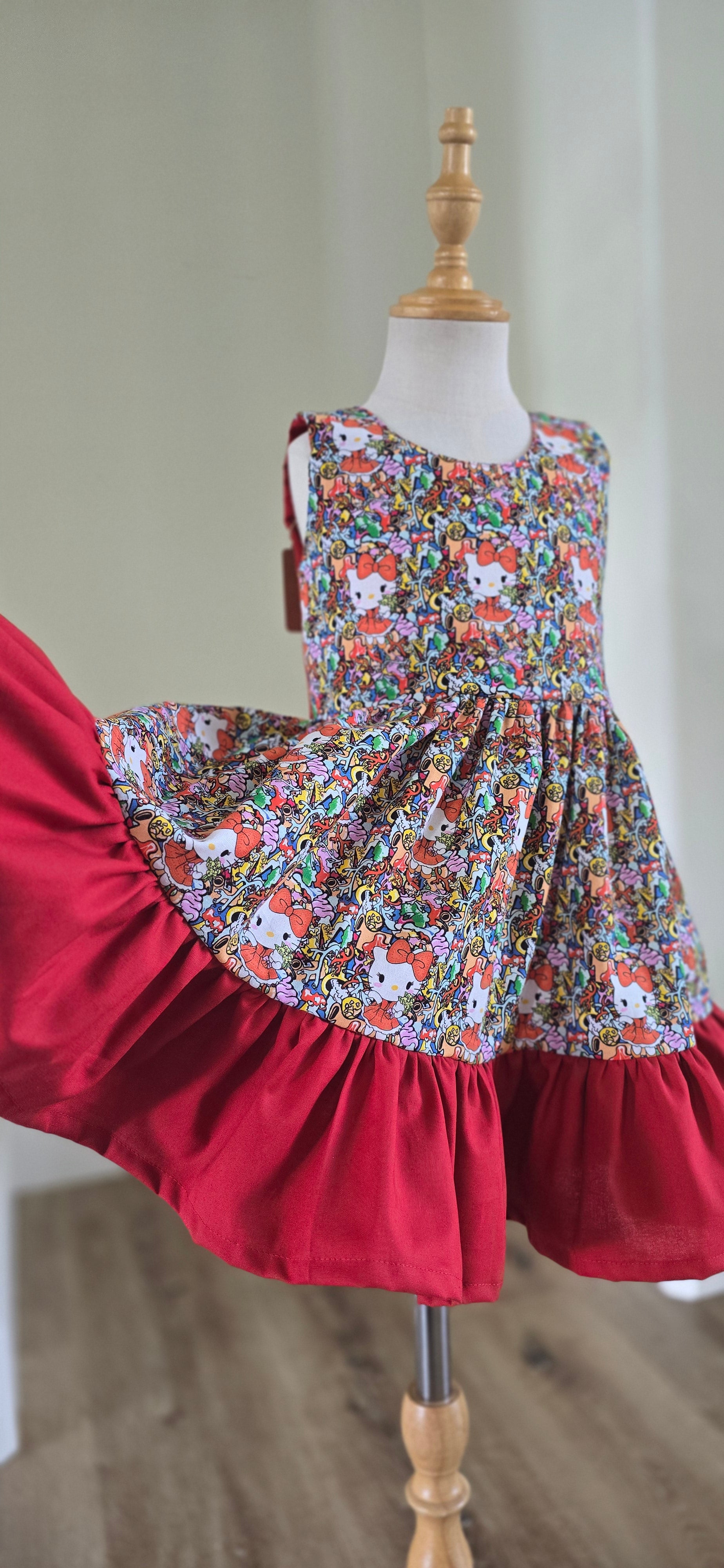 Sleeveless dress with 2 tier skirt. Your favorites character print and red secondary color (second tier skirt and back bodice). Stretchy back. 100% cotton.
