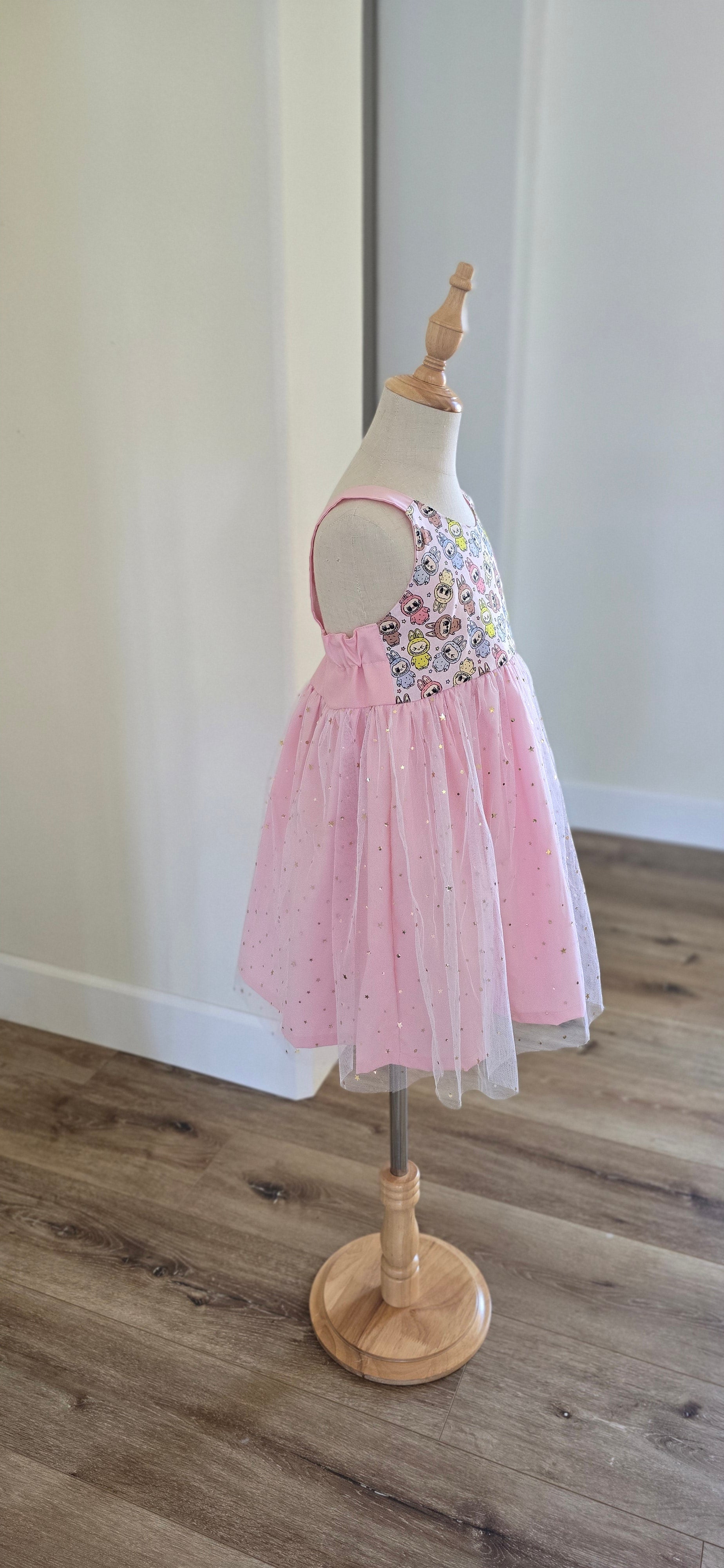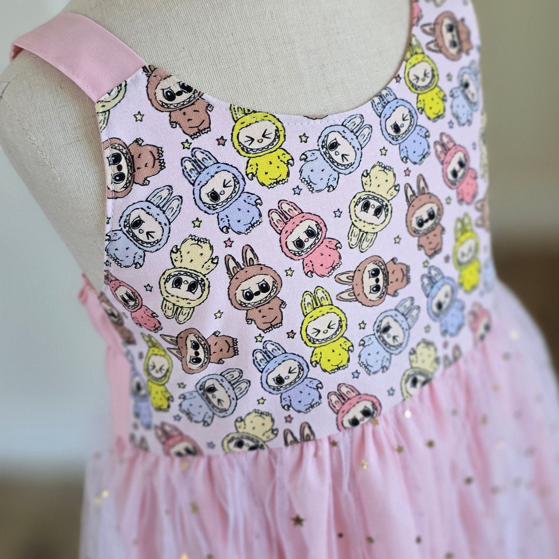 Features main characters on the front bodice, dress skirt layered with stars tulle. Wide straps. Stretchy back. 100% cotton and tulle.