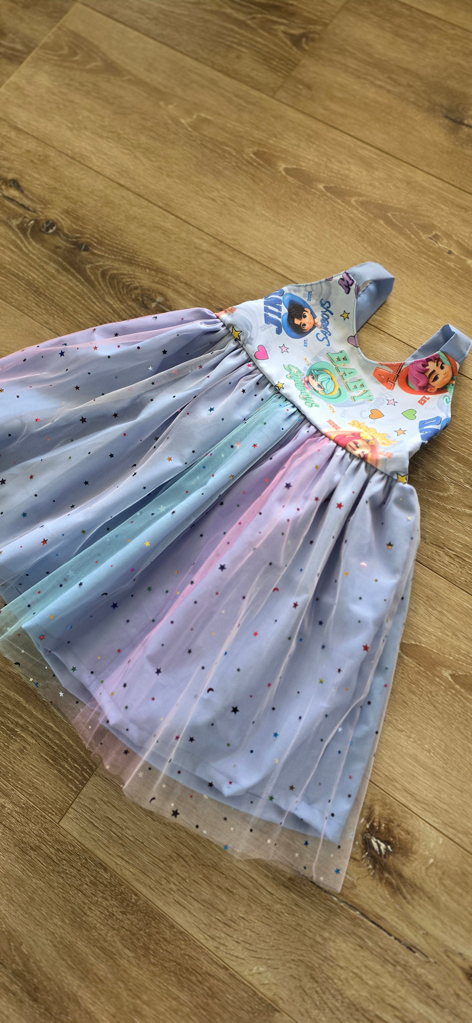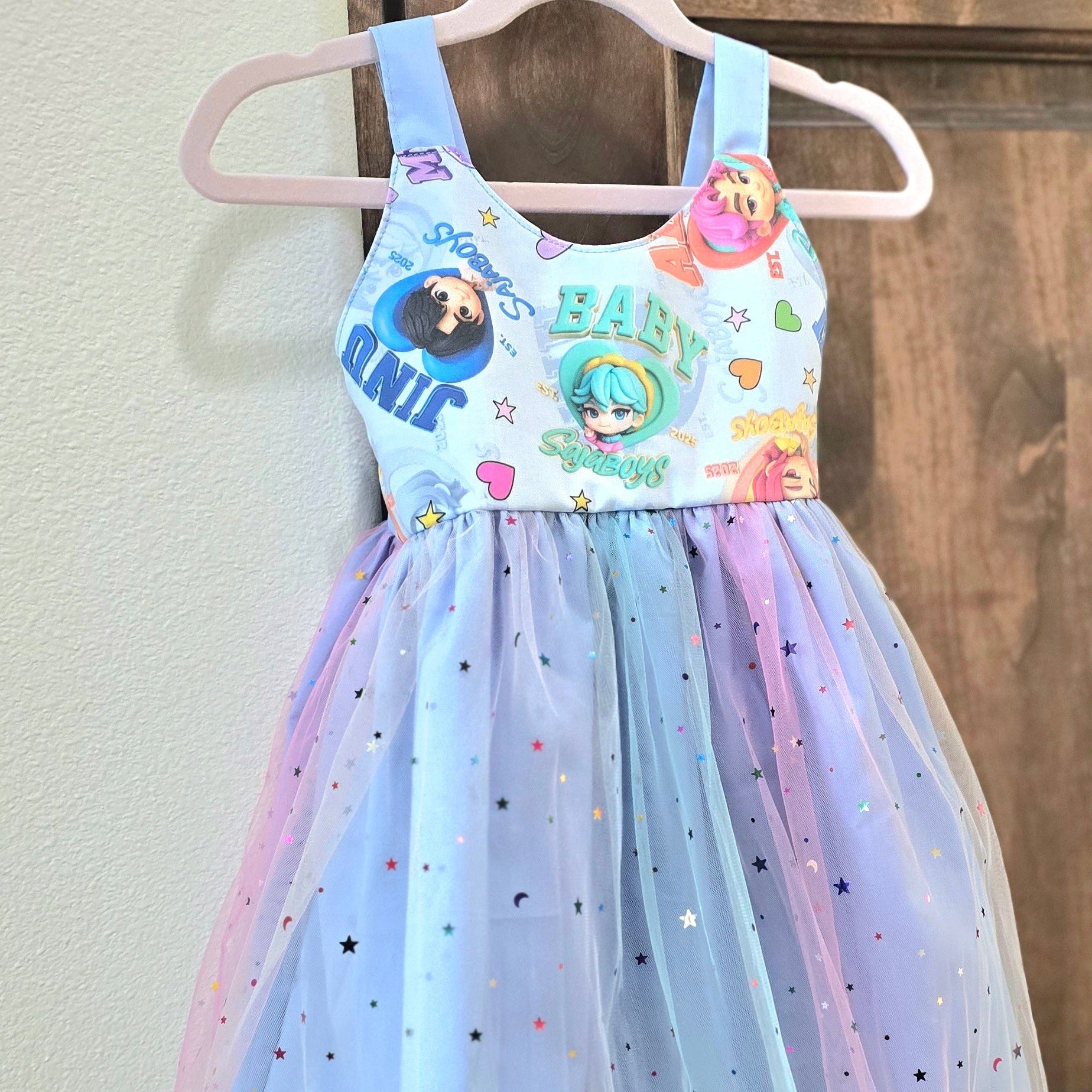 Features Saja Boys band characters all over print. Dress skirt layered with stars tulle. Wide straps. Stretchy back. 100% cotton and tulle.