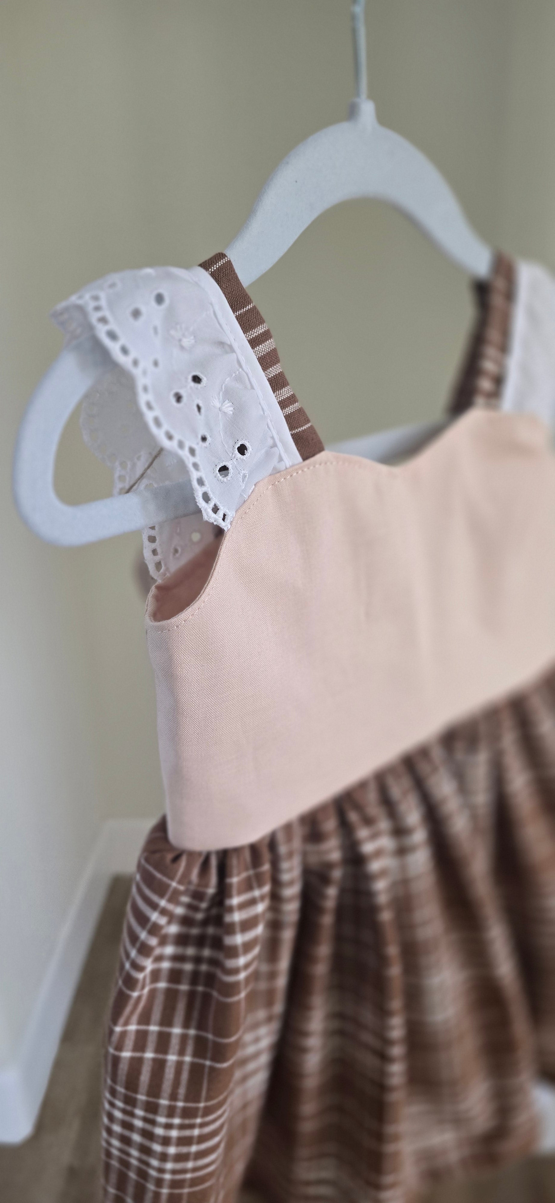 Adorable Thanksgiving outfit! Featuring sweet heart bodice, elegant lace straps, plaid skirt in fall hews and a stratchy back.