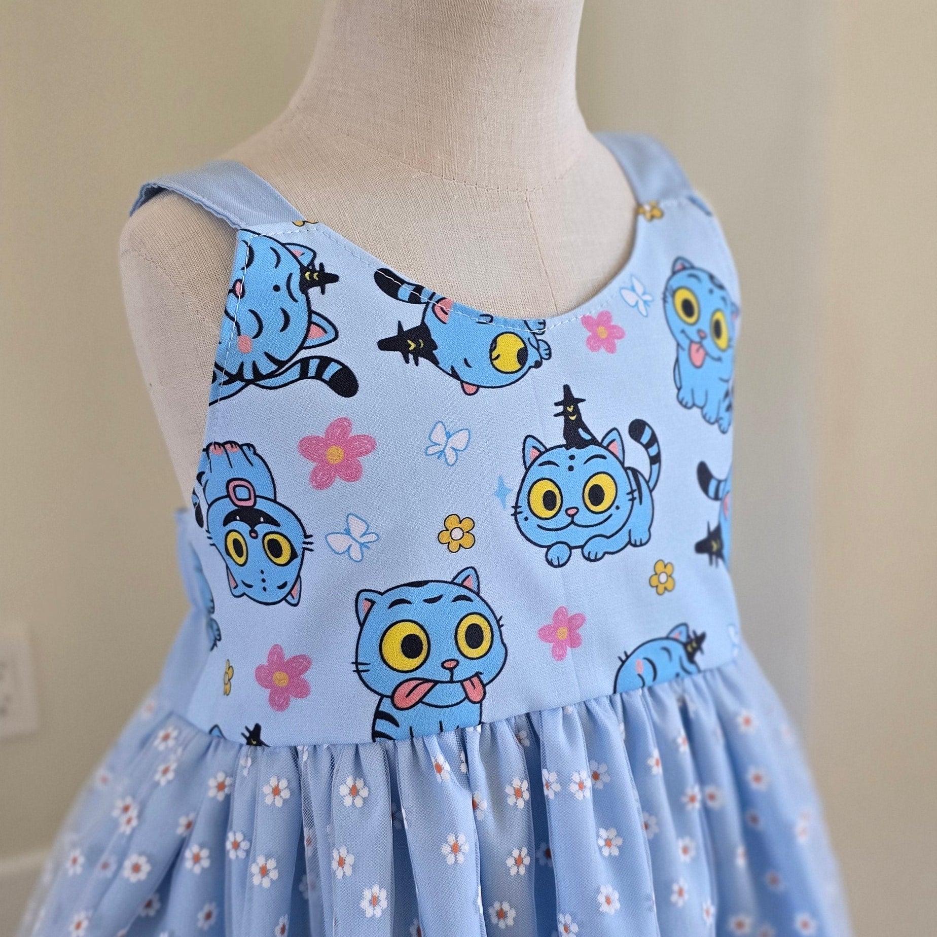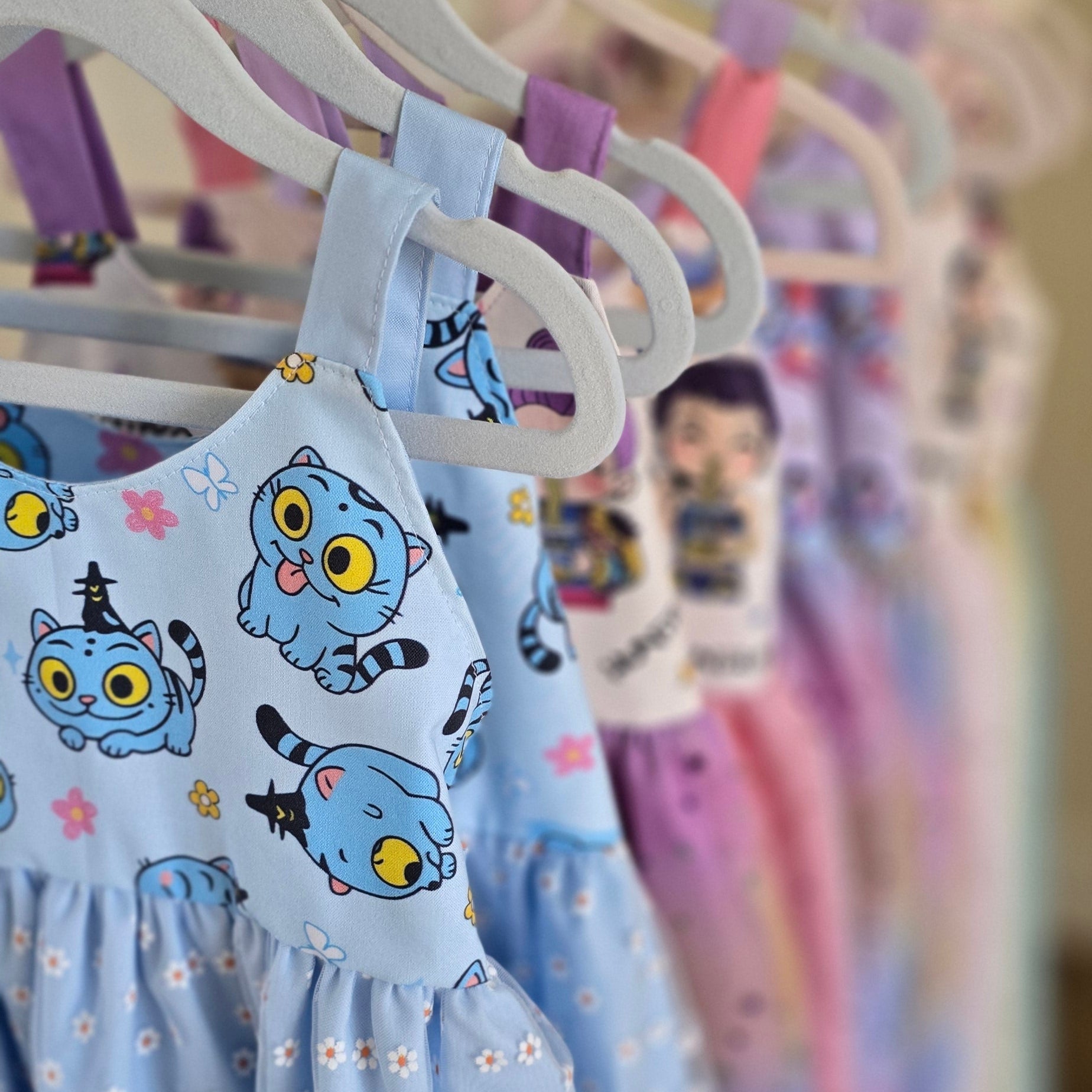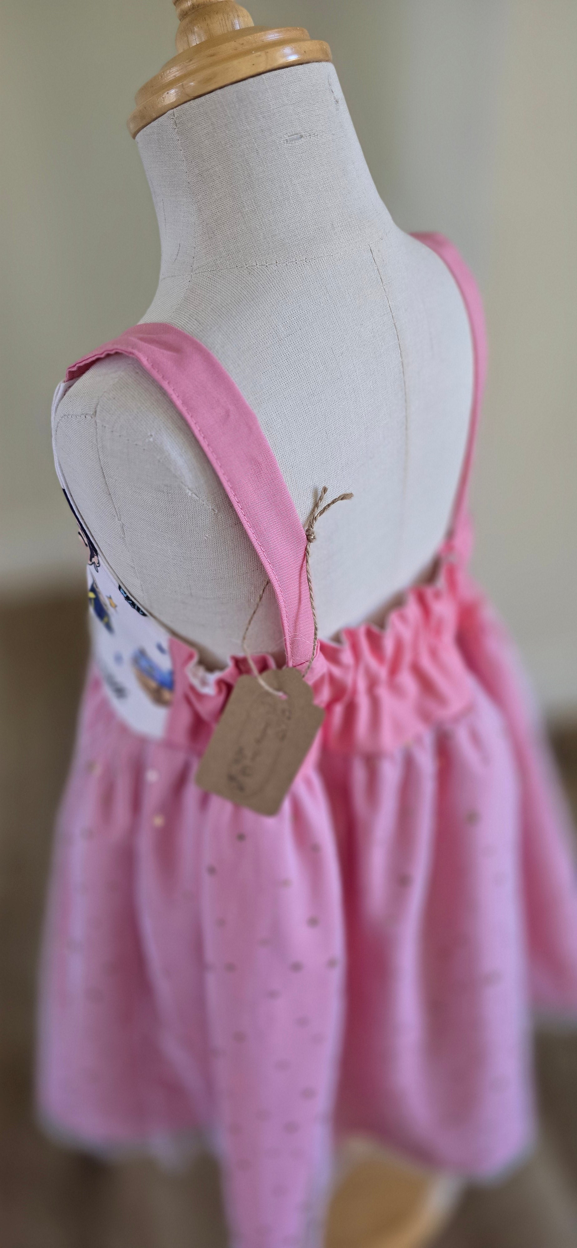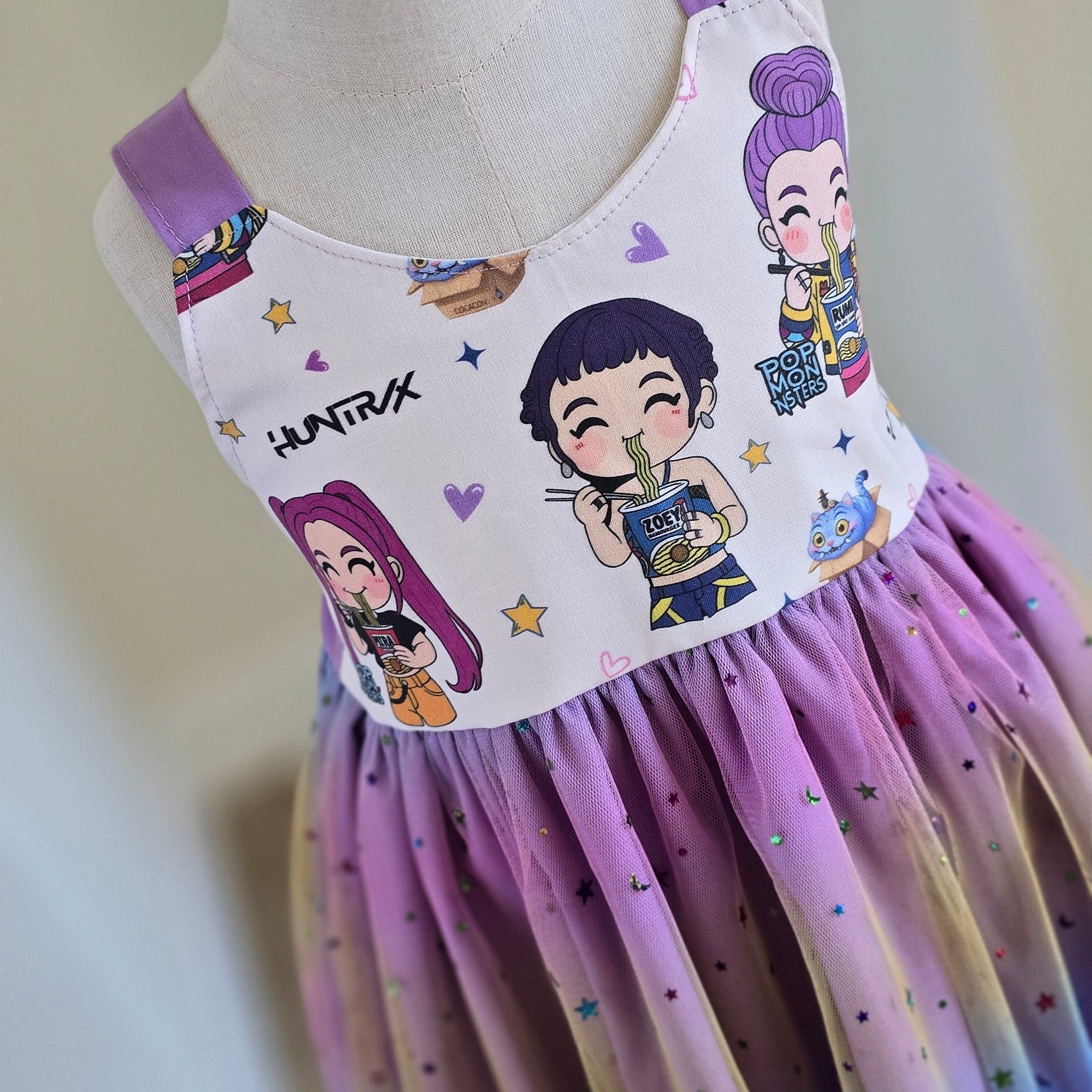 Features main characters on the front bodice, dress skirt layered with ombre gradient/stars/daisies tulle. Gradient tulle color may slightly vary from item to item due to its pattern. Wide straps. Stretchy back. 100% cotton and tulle.